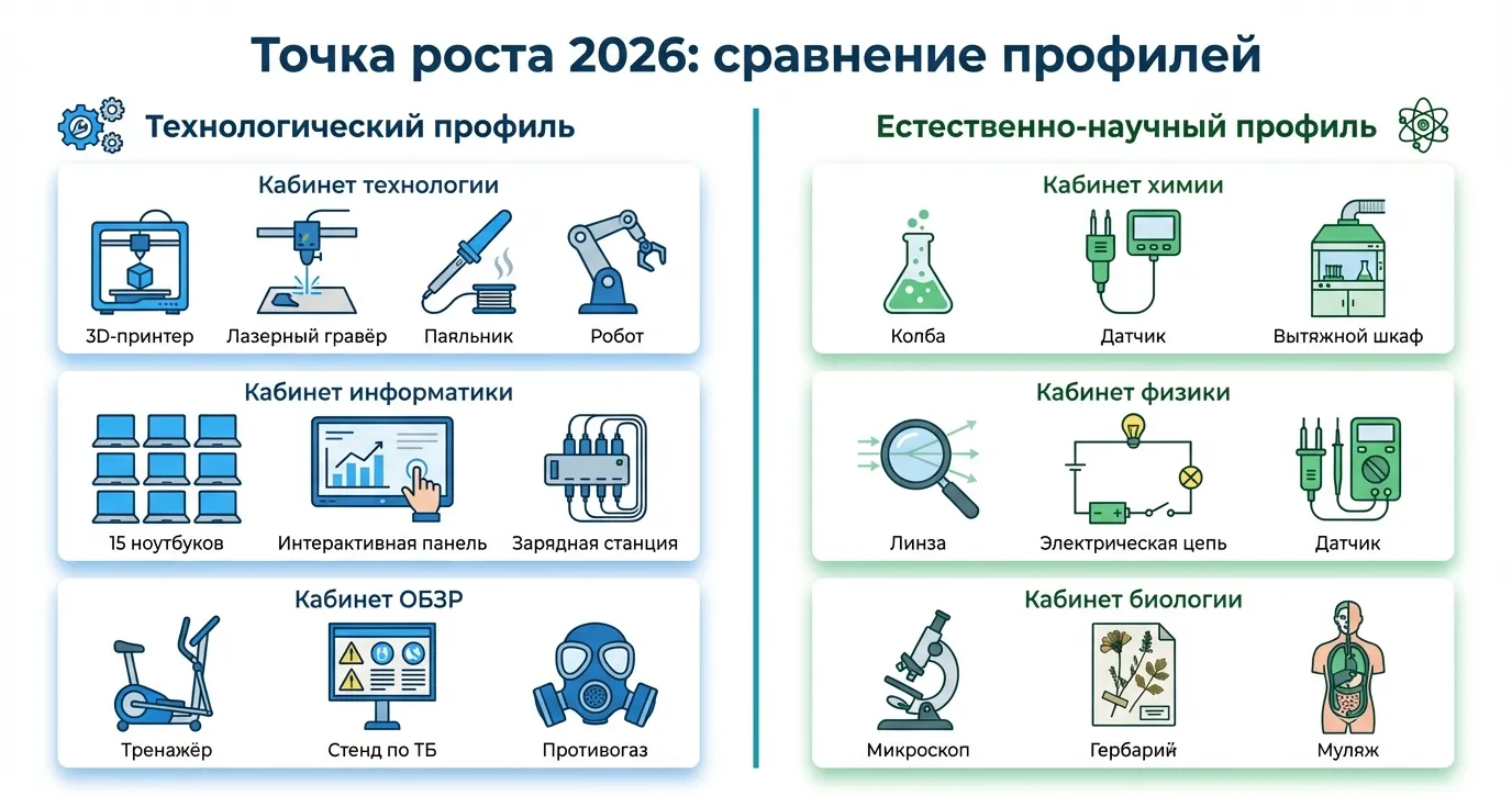 Два ключевых момента, которые важно зафиксировать на старте. Первый: Точка роста — это не отдельный кружок и не факультативное дополнение. Это структурная часть школы с обновлёнными кабинетами, в которых проводятся уроки по расписанию. Второй: профиль определяет состав оборудования полностью — технологический и естественно-научный комплекты не пересекаются почти ни в одной позиции.