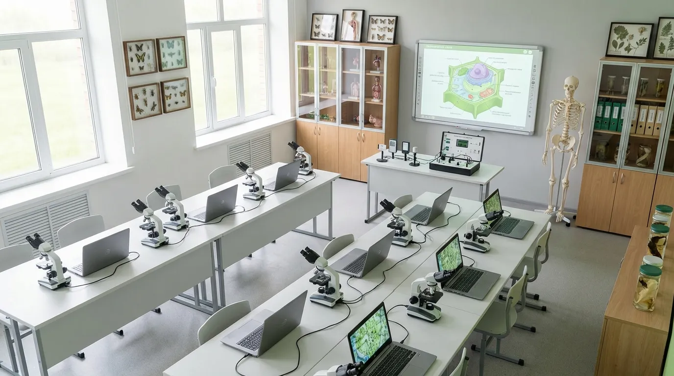 Биология соединяет работу с натуральными объектами и цифровые инструменты исследования. Ученик изучает клетку не по рисунку из учебника, а под цифровым микроскопом с выводом изображения на экран.