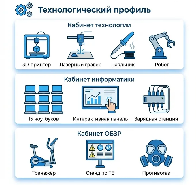 Технологический профиль охватывает три предметные области: «Технология», «Информатика» и «ОБЗР» (основы безопасности и защиты Родины). Школа получает кабинет технологии с производственным оборудованием (3D-принтер, лазерный гравёр, робототехника), компьютерный класс и кабинет ОБЗР с тренажёрами и макетами. Этот профиль подходит школам, которые делают акцент на инженерном и цифровом образовании, проектной деятельности, подготовке к олимпиадам по технологии и информатике.