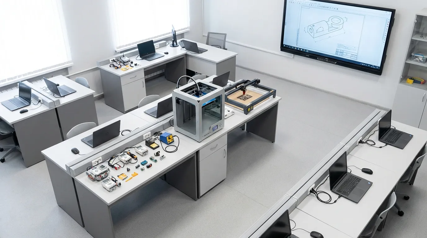 - ПК/ноутбуки — для CAD-проектирования, программирования робототехники, подготовки файлов для 3D-печати и лазерной гравировки.