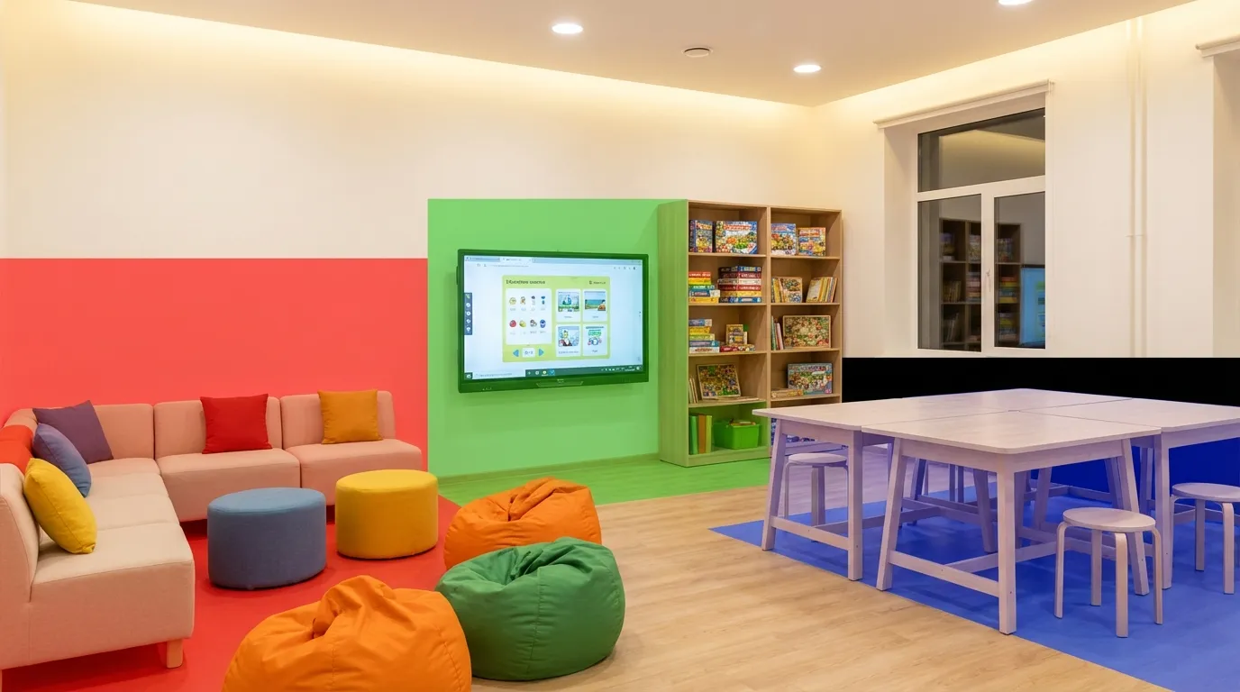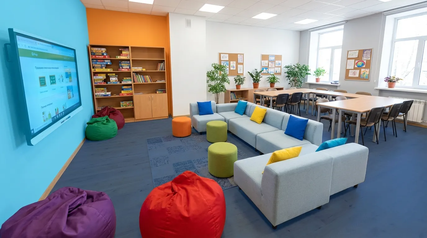 Принципиальное отличие ЦДИ от обычного учебного кабинета — добровольность. Сюда не приходят по расписанию. Сюда заходят, потому что хотят. Именно поэтому оснащение центра строится по другим принципам: мягкая мебель вместо жёстких парт, трансформируемое пространство вместо фиксированной рассадки, досуговая зона рядом с рабочей.