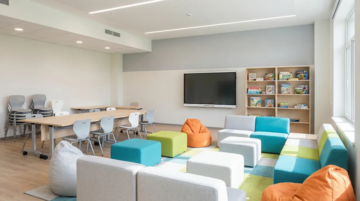 Мягкая мебель формирует атмосферу центра. Именно она отличает ЦДИ от учебного кабинета и создаёт ощущение пространства, в которое хочется возвращаться. Модульность — ключевое требование: конфигурация зоны отдыха должна меняться за несколько минут без инструментов.