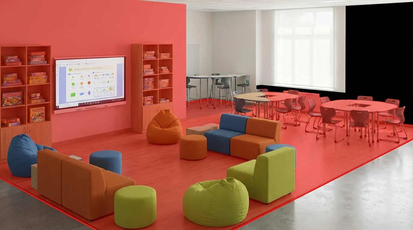 Зона отдыха и неформального общения. Мягкая мебель — диваны, пуфы, кресла-мешки. Здесь ученики проводят перемены, общаются, играют в настольные игры. Мебель подбирается модульная, легко перемещаемая — чтобы при необходимости быстро изменить конфигурацию. Обивка — износостойкая, допускающая влажную уборку. Пуфы и кресла-мешки легко сдвинуть к стене, освободив пространство для мероприятия.