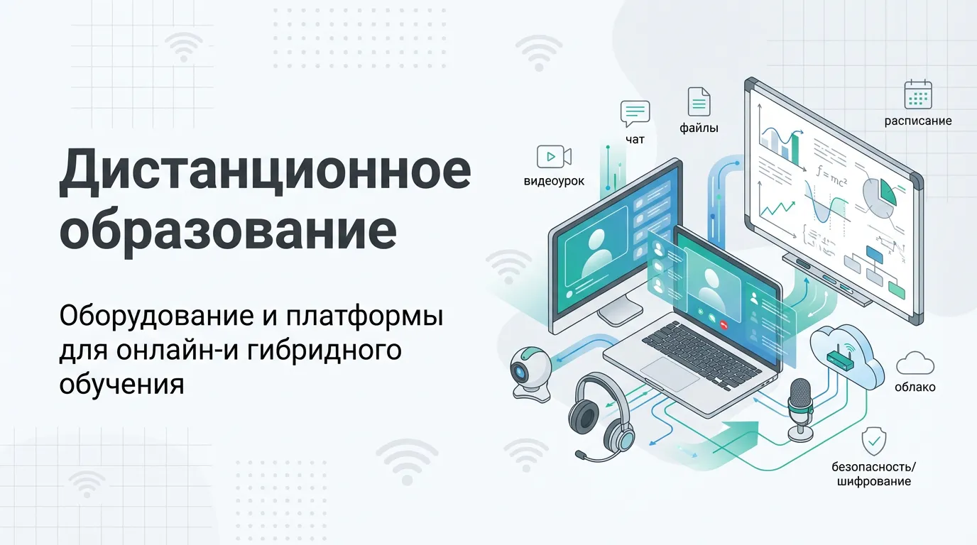 Нужна консультация или не можете выбрать? Оформите заявку на сайте, мы свяжемся с вами в ближайшее время и ответим на все интересующие вопросы.Категория «Дистанционное образование» создана для учреждений, которым нужно организовать устойчивый учебный процесс вне аудитории или в смешанном формате. Здесь собраны решения, которые помогают проводить онлайн‑уроки, консультации, занятия по программам дополнительного образования, а также поддерживать обучение во время замен, карантинных ограничений или при работе с детьми на индивидуальных траекториях. Раздел ориентирован на практические задачи руководителей и специалистов по закупкам: быстро подобрать комплект, согласовать состав поставки и заказать оборудование и ПО в одном месте.