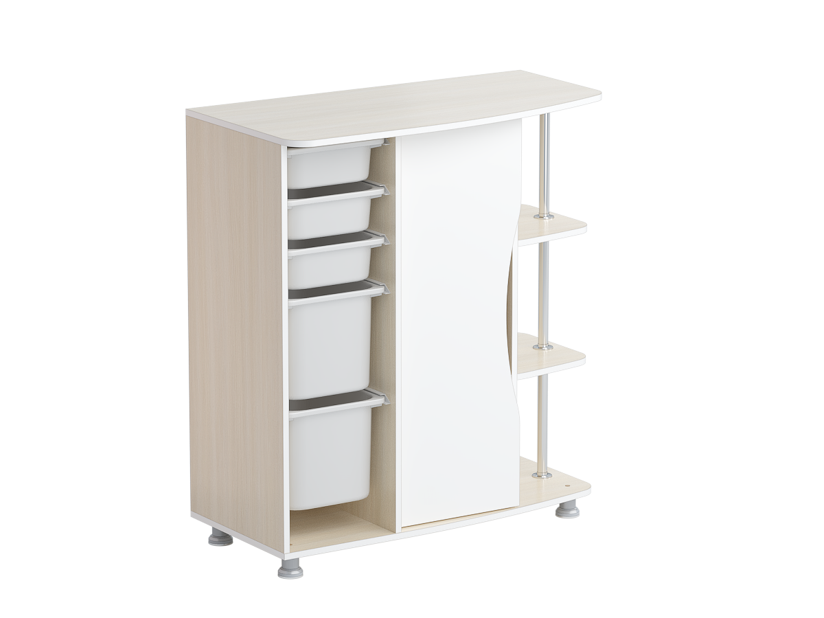 Третья секция оборудована выдвижными лотками разной высоты (четыре лотка высотой 100 мм и два лотка высотой 230 мм), облегчающими сортировку и размещение игрушек, книг и учебных материалов.
