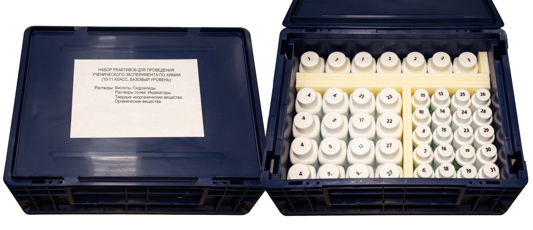 Общее количество флаконов в наборе - 43, в т.ч. 23 флакона по 100 мл и 20 флаконов по 50 мл. Часто используемые реактивы (кислоты, щелочи и др.) размещены в нескольких флаконах.