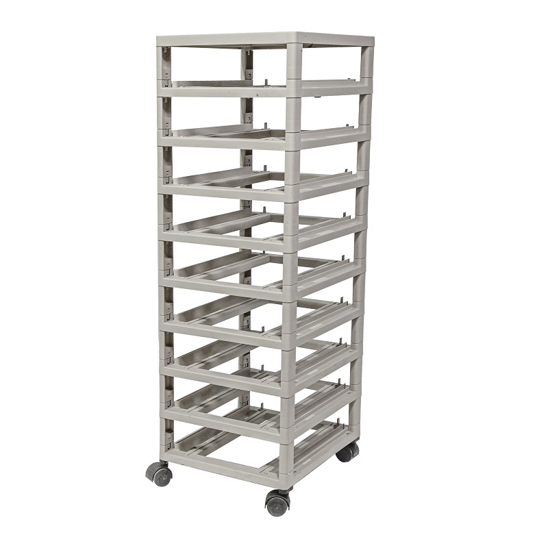 Стойка для лаборатории выполнена в виде литой конструкции из пластмассы с роликовыми колесами и имеет форму полочного стеллажа.