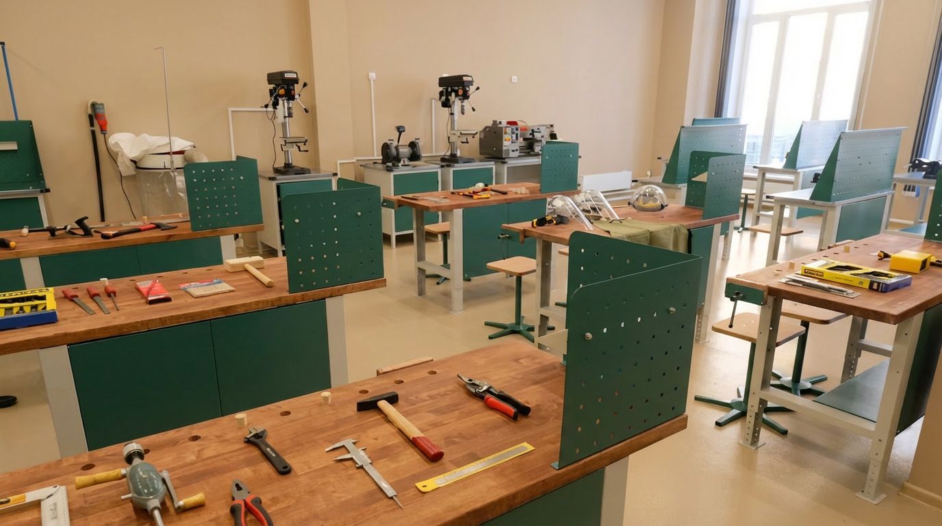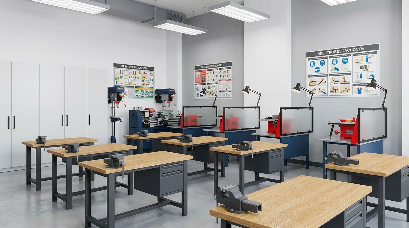 - Оборудование: Верстаки (столярные/слесарные/универсальные), станочный парк (ТВ-7М, НГФ-110 и современные аналоги с ЧПУ), заточные станки, тиски.