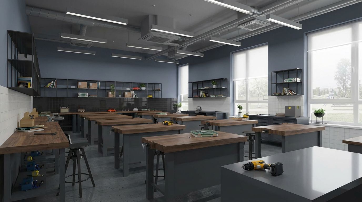 - 3D-визуализация проекта бесплатно. Перед закупкой вы увидите, как будет выглядеть ваш кабинет технологии 2026. Мы расставим мебель и станки в 3D-модели вашего помещения, чтобы исключить ошибки в эргономике.